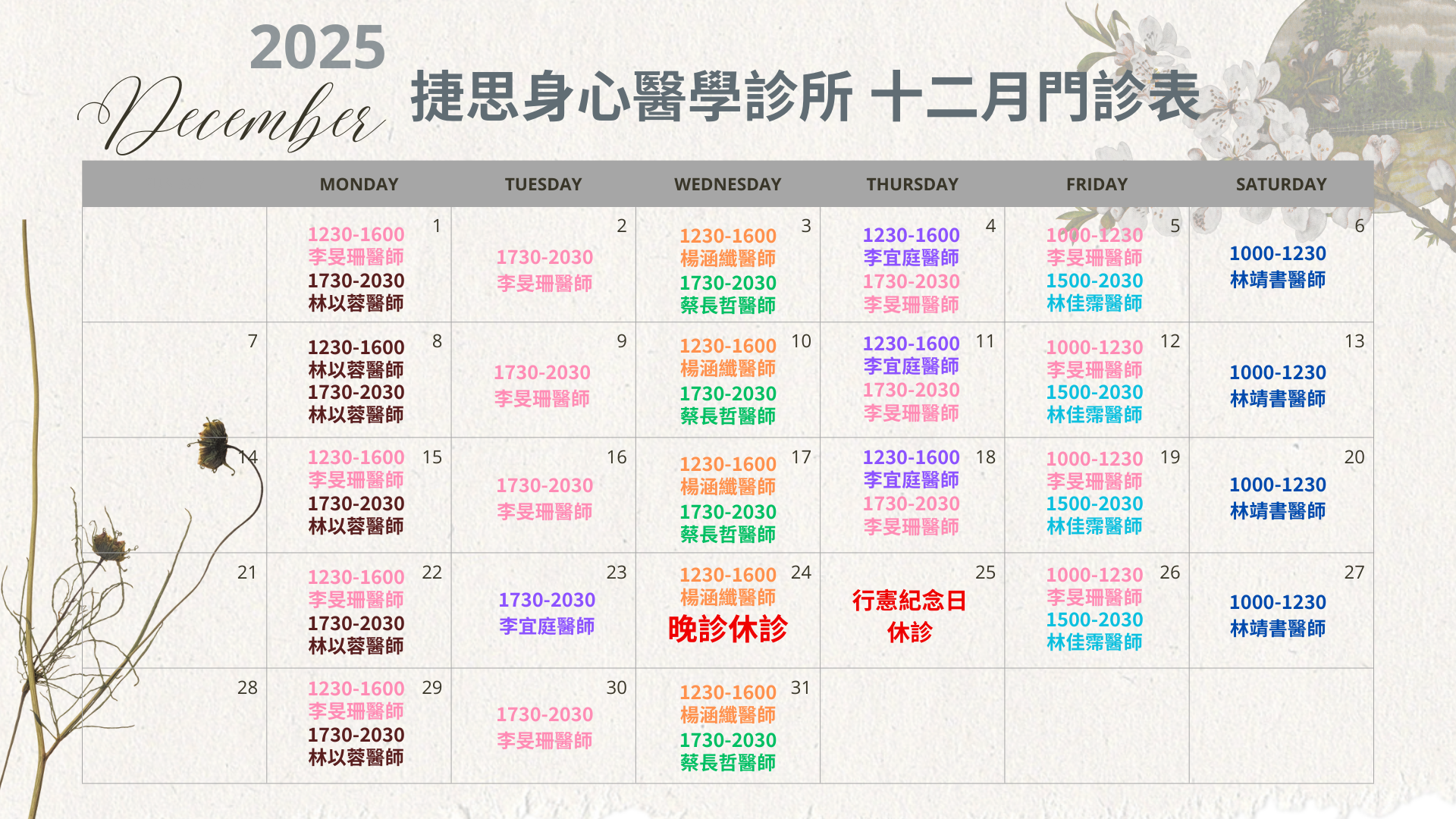 2.預約時將會將三次諮商時間訂出,若需調整請一個工作天前通知診所
